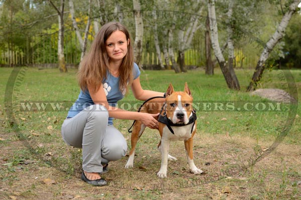 This Amstaff harness is produced in 4 different sizes and therefore may fit Amstaffs of different age. Moreover the item is three-way adjustable so you can adjust it to fit to your Amstaff's dimensions.