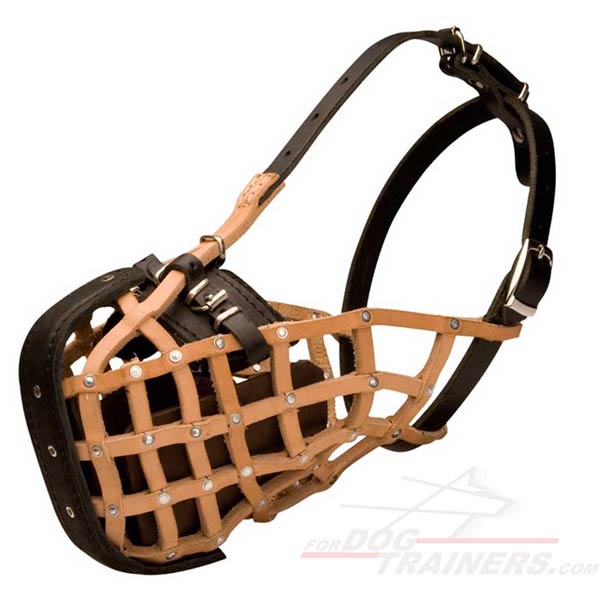 The spotless design of this basket leather dog muzzle won't leave you indifferent. It is made of selected soft genuine leather. Narrow straps woven together and fixed with the help of rivets create an image of a leather basket. Due to this shape the muzzle is best ventilated among other leather muzzles. There is soft felt padding on the nose and on both side parts for maximum comfort and to prevent snout rubbing. There is also steel bar covered with leather and placed in a front part of the muzzle. It protects your dog's snout from traumas during agitation / attack training. The adjustable straps allow you to fit the muzzle to your dog's size.